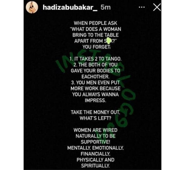 According to her, when people ask what does women bring to the table apart from $3x they seem to forget that it takes two to tango and both parties give their bodies to each other and men even put in more work because they always want to impress.