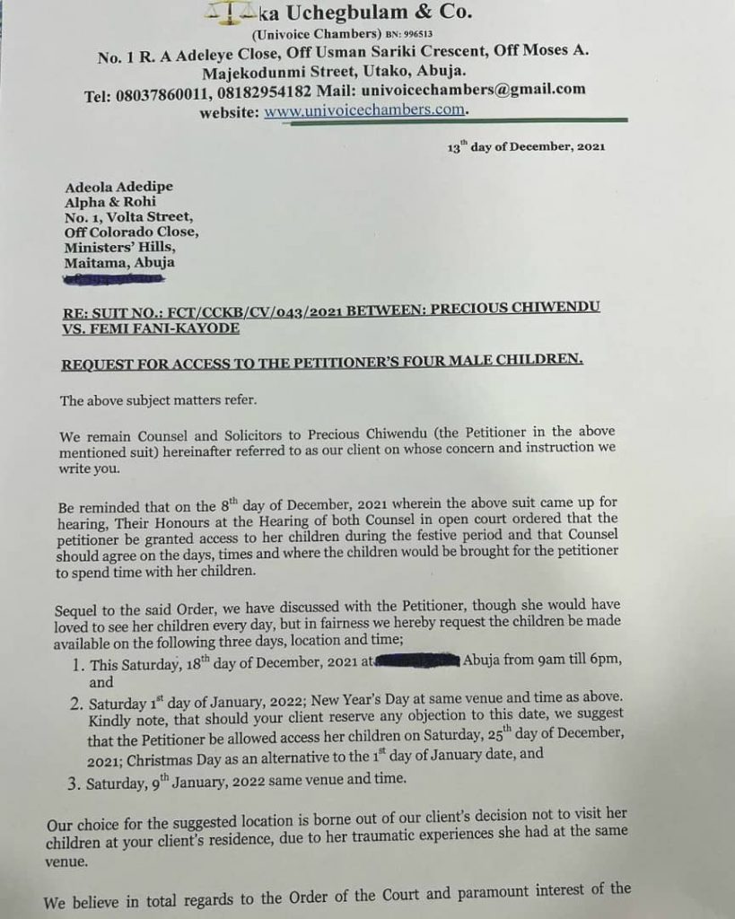 Ex-beauty queen, Precious Chikwendu, has shared a copy of the letter her lawyers wrote to her estranged husband, Femi Fani-Kayode, asking that he obeys the court order for her to see their four children, at least three times this festive period.