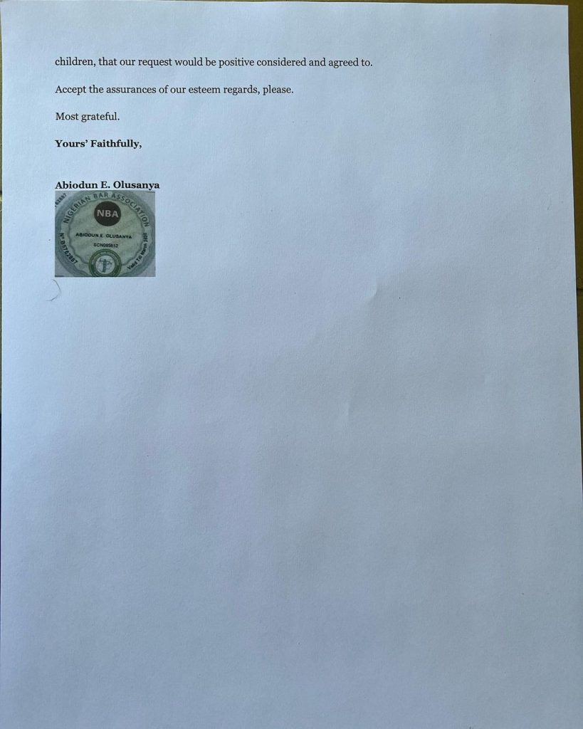 ”It wasn’t too much to ask for. Very considerate to ask for some hours, 3 times during this festive season till the court sits again on the 19th January to decide and determine custody. They received this letter since the 13th.