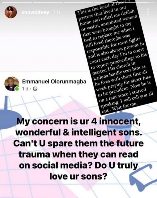 Taking to her Instastory, Precious wrote, “This is the head of the 7 pastors that lived in our home and called me Delilah or Vashti, anointed women that were brought in my bed to replace me when i still lived there, he was responsible for most fights and is also always present in court each day I’m in court to report proceedings to his master.