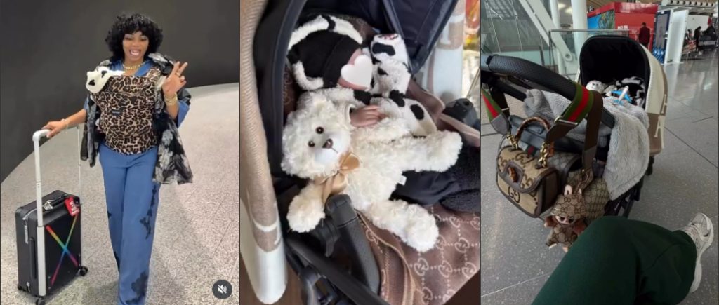 She also posted a photo collage on the joint account she runs with her spouse, including a snapshot of herself neatly dressed while pushing baby Rakeem in a stroller at the airport.