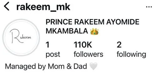 His bio proudly displays his full name Prince Rakeem Ayomide Mkambala along with the note, “Managed by Mom & Dad.”