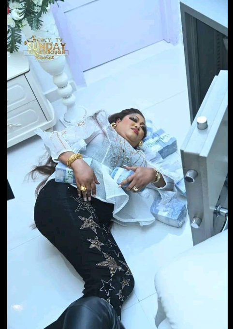 His wife couldn’t believe her eyes when she saw wads of money worth N55 million in the safe. She could be seen sleeping on the bundles of money wrapped in nylon with joy and happiness.