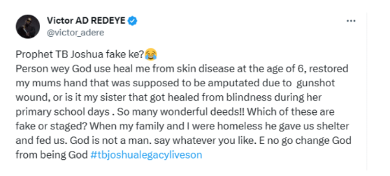 But Victor AD refuted the accusations of fabrication and upheld the clergyman’s integrity by sharing on social media his personal experiences with the late TB Joshua.