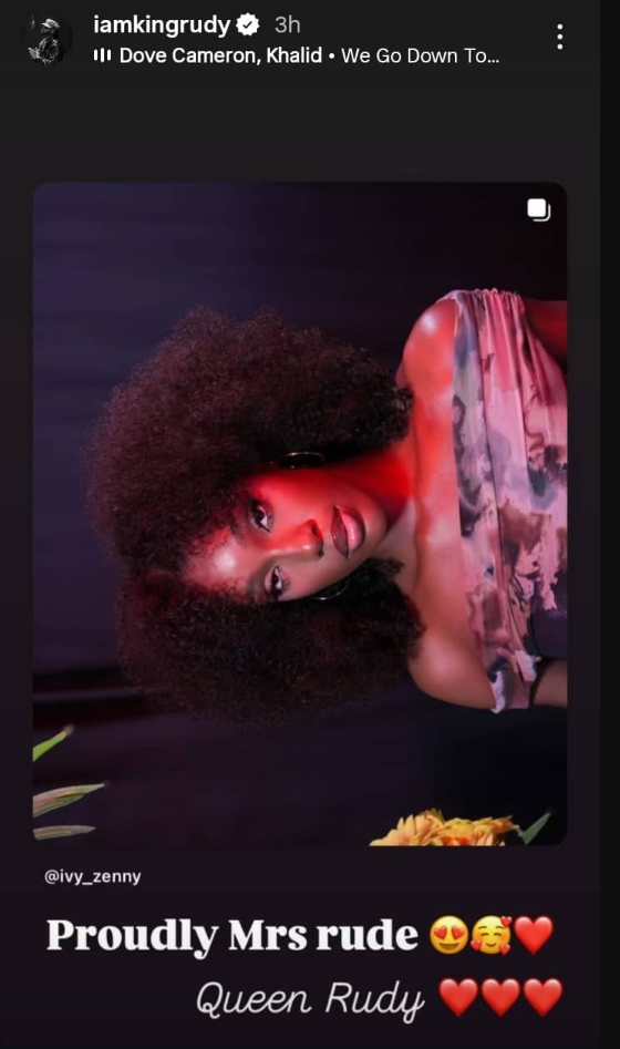 The music star, who tied the knot with Ifeoma last year, shared a photo of her on his Instagram story, proudly referring to her as “Mrs Rudy.” In the heartfelt post, he also crowned her his “Queen” while adding multiple love emojis, leaving fans gushing over the romantic display.