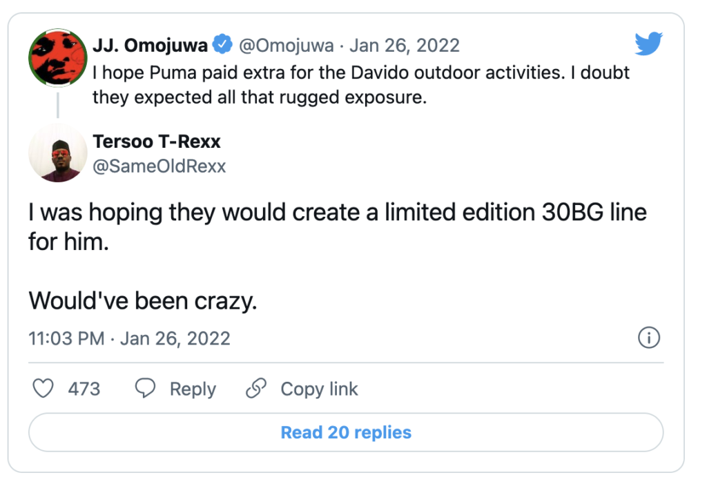 Puma should establish a fashion line for Davido, according to a fan named @SameOldRexx.
