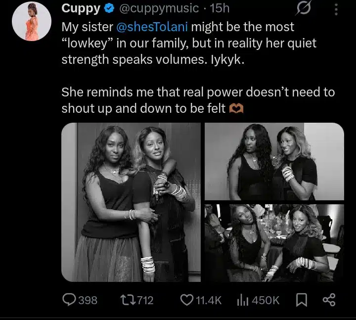 Recently, DJ Cuppy took to X (formerly Twitter) to celebrate her older sister, describing her as the most reserved member of their family yet one whose calm strength leaves a lasting impact.