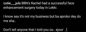 Social media is abuzz with news of Big Brother Naija star, Rachael Edwards, reportedly undergoing facial enhancement surgery.