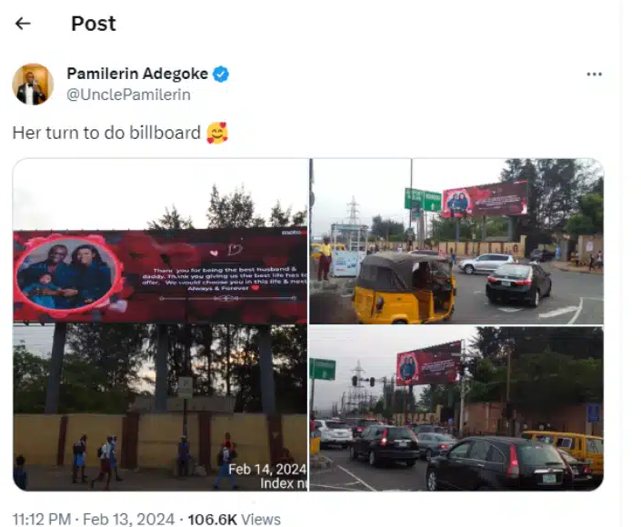 A Nigerian woman named Motun has set the example by celebrating her husband on Valentine’s Day with a large billboard.