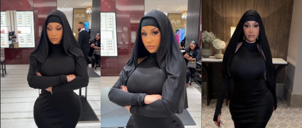 In one of the videos, she is seen wearing a striking all-black ensemble: a floor-length dress with a high halter neckline, long black gloves, and a hood draped elegantly over her shoulders.