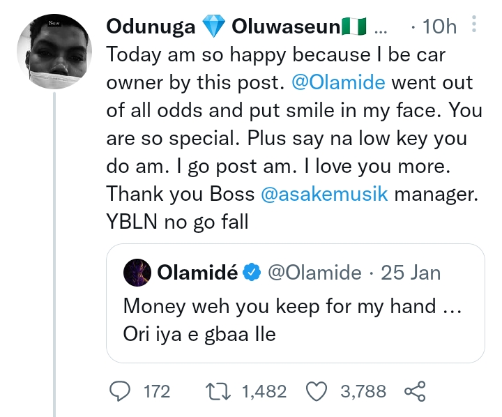 Iconic rapper, Olamide has surprised fan who with a car months after the fan begged him for it.