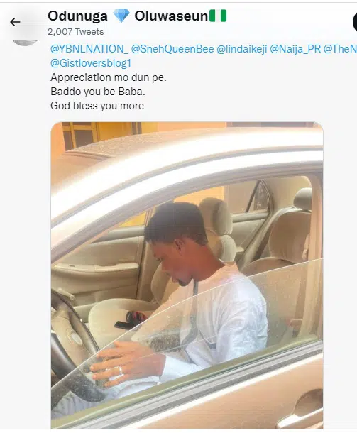 The Twitter user took to his social media page to reveal that the singer has made him a car owner.
