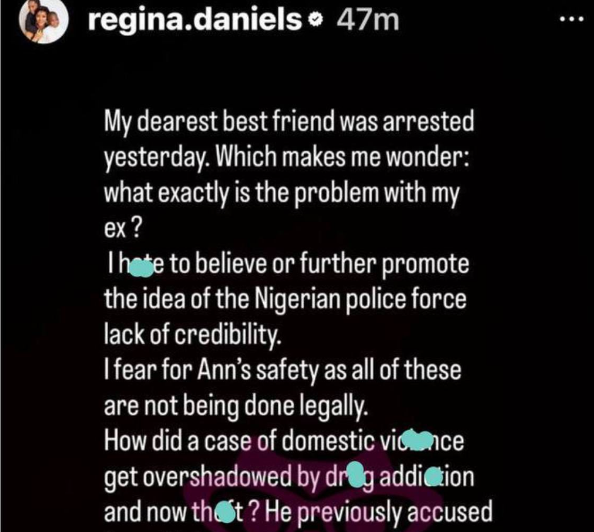 Nollywood actress Regina Daniels has publicly addressed her estranged husband, Senator Ned Nwoko, following the alleged arrest of her close friend, Ann.