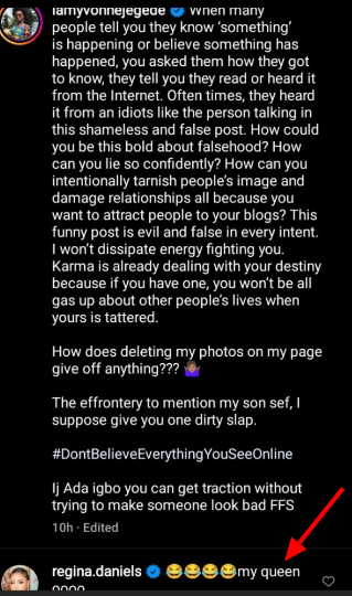 Apparently amused by the blogger’s allegation, Regina reacted in the comment section of her colleague, Yvonne Jegede’s post.