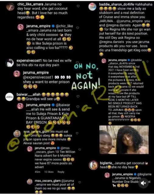The billionaire’s wife was a brand ambassador for Jaruma and she shared videos and photos of most of her products, and now Jaruma is claiming that Regina never returned any of the products she gave her or they used in the advert.