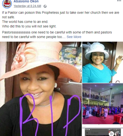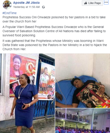 Fellow religious leaders took to Facebook to mourn Prophetess Success Oni Onwaeze, who was the General Overseer of Salvation Solution Centre of All Nations. The religious leaders claim Prophetess Onwaeze was poisoned by “pastors in her ministry in a bid to hijack the church from her.”
