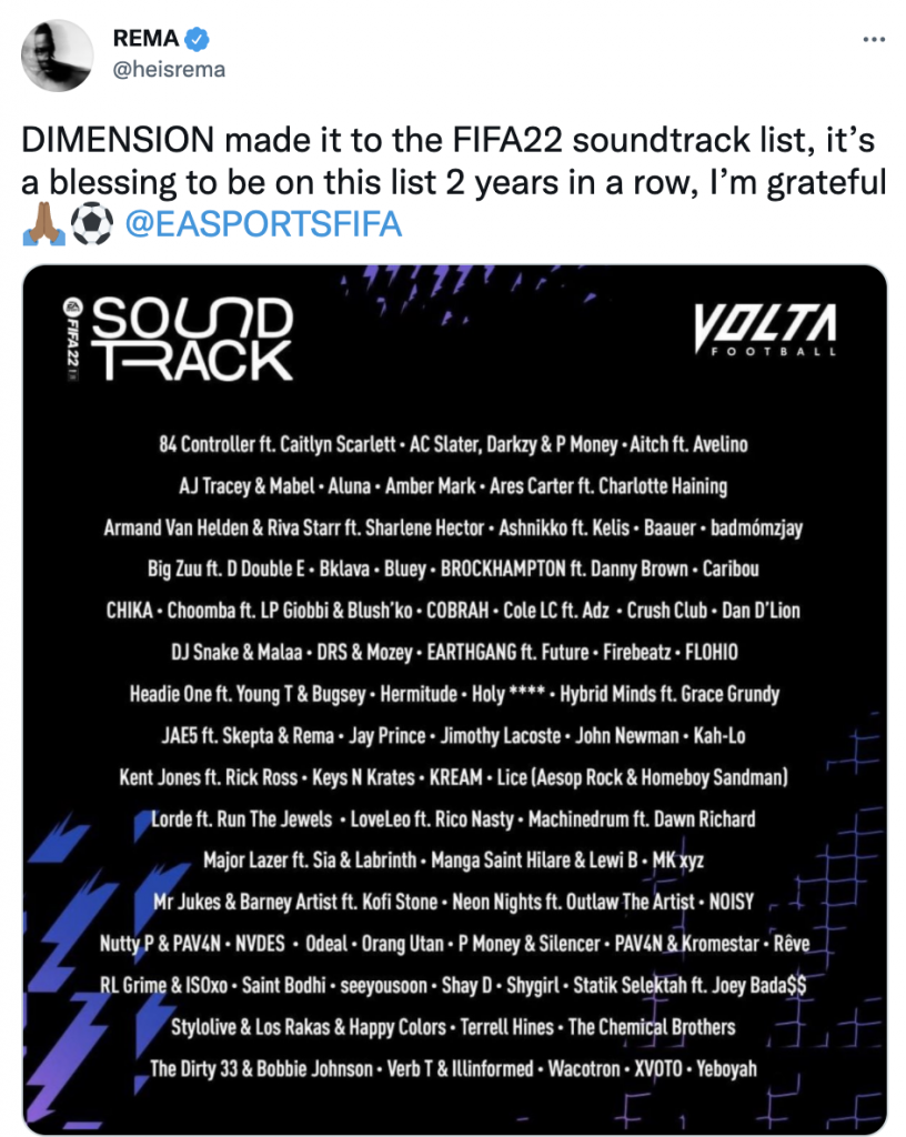“DIMENSION made it to the FIFA22 soundtrack list, it’s a blessing to be on this list 2 years in a row, I’m grateful @EASPORTSFIFA”