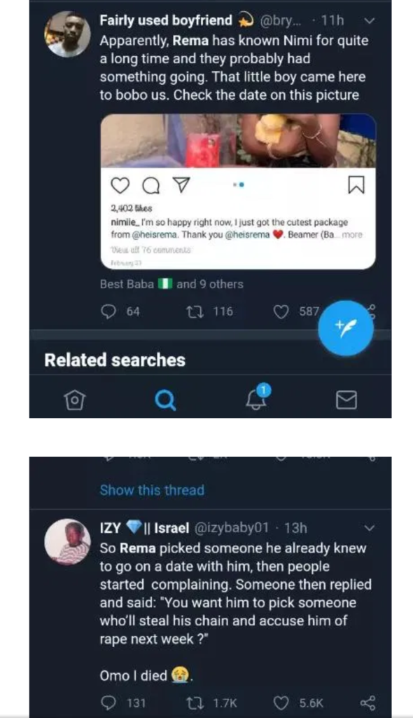 Fast rising Nigerian singer Rema, has been exposed by social media users after he posted the photo of a lady to be the winner of his date meeting with a female fan.