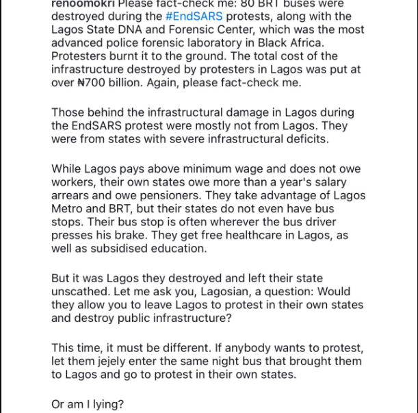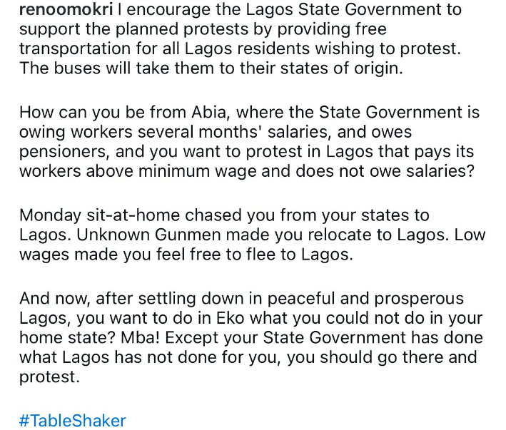 In an Instagram post, Reno asked how a person from Abia state, where the state government reportedly owes workers salaries, could protest in Lagos, where state public servants and pensioners are promptly paid.
