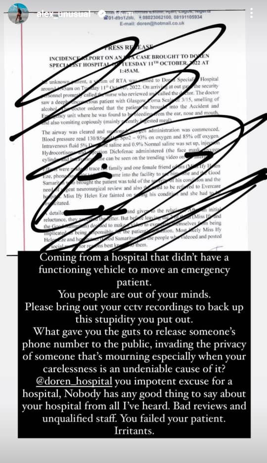 In a post stated on her Instastories, Alex demanded that the hospital release its CCTV recording to back up its claims. Read what she wrote below