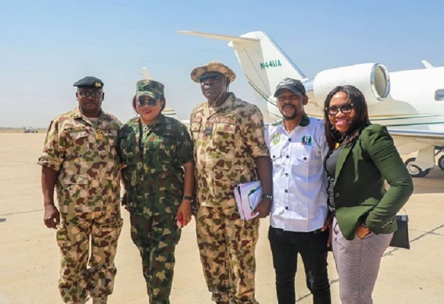 Joined by Rita Daniels and other Celebrities, the Team of Tribute to our Troops; the Unsung Heroes Concert visited the military troops at the Maiduguri base to encourage military personnel, draw civilians close to the military and using celebrities with impressive records as Ambassadorial bridges to the people.
