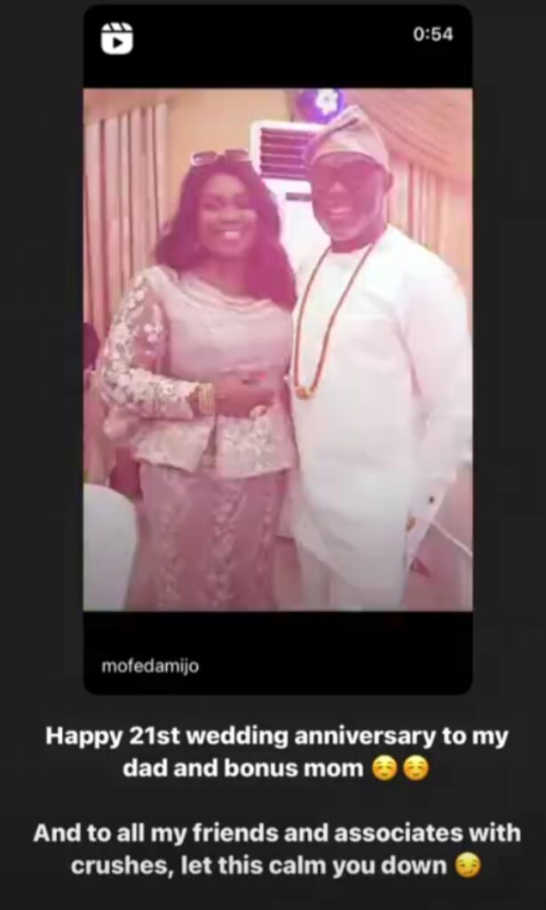 “Happy 21st wedding anniversary to my dad and bonus mom,”
