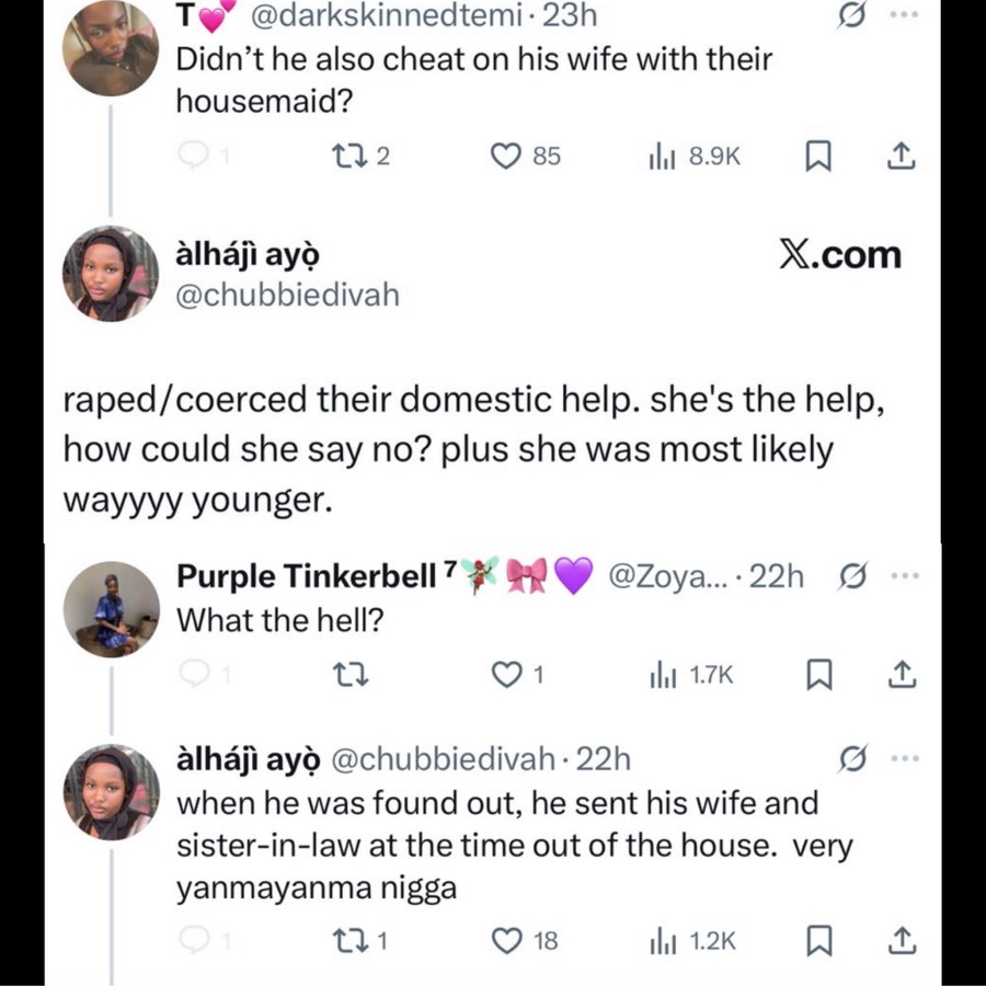 The situation escalated when @chubbiedivah, under the same category of accounts, posted a more serious allegation claiming the singer “raped/coerced their domestic help. She’s the help, how could she say no? plus she was most likely wayyyy younger.” She added, “When he was found out, he sent his wife and sister-in-law at the time out of the house. very yanmayanma nigga.”