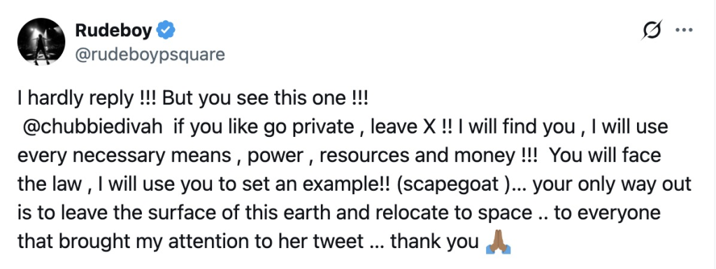 Fans alerted Rudeboy to the posts, prompting him to respond publicly on X, stating he would find the user and “use every necessary means, power, resources and money” to hold them accountable.