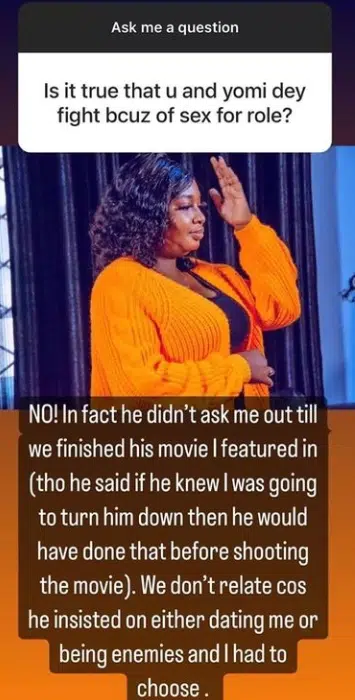 Mo Bimpe made this known while answering a fan’s question on if she is in dispute with him over sex for role allegation.