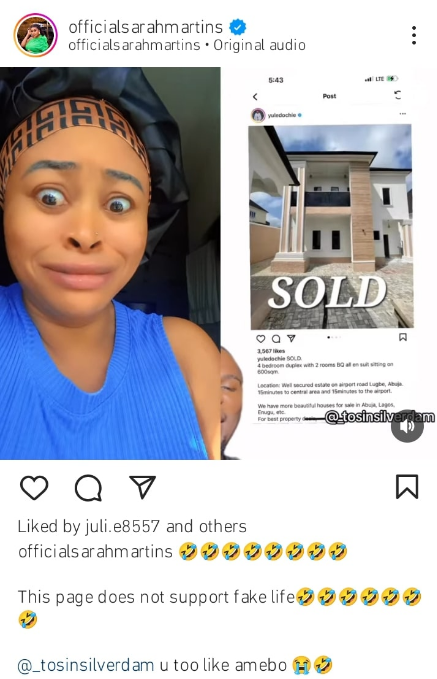 Sarah Martins reposted Tosin Silverdem’s video with a video of herself laughing as she jokingly slammed the blogger for being a gossip lover.