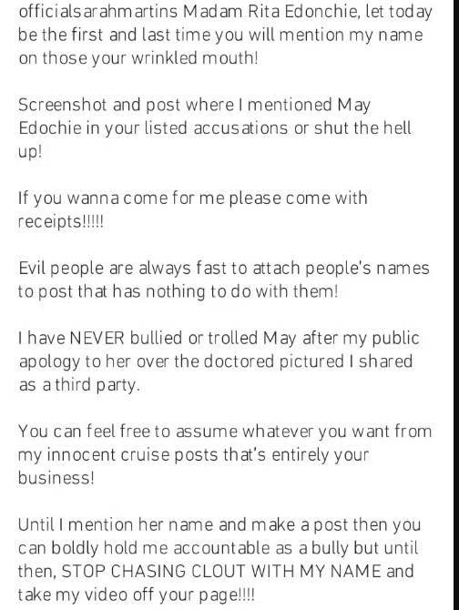 “I have NEVER directly or indirectly bullied May Edochie on my page so before you accuse me of bullying please come correct! Screenshot where I mentioned her name on my posts or shut the hell up!”