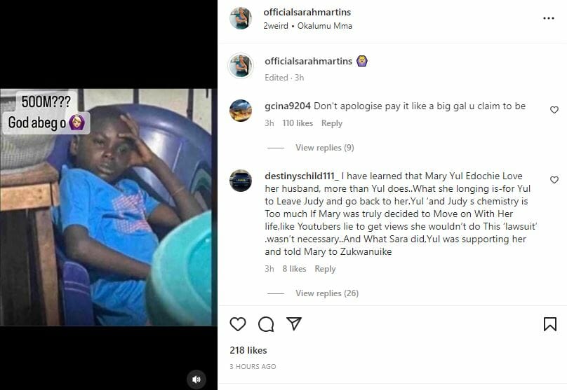 She gave Sarah 14 days to apologise or face legal actions which will include a whopping sum of N500M for damages.
