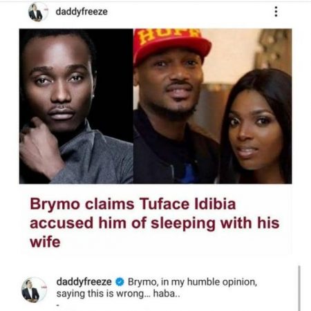 Controversial Media personality Daddy Freeze in his humble opinion has rebuked Brymo for claiming 2Face Idibia accused him of sleeping with his wife Annie Idibia saying it was wrong of him to say that.