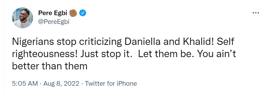“Nigerians stop criticizing Daniella and Khalid! Self righteousness! Just stop it. Let them be. You ain’t better than them”