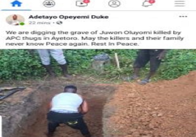 My nephew Olorunjuwon who was shot at my poling unit yesterday died this morning. My brother your death is a Supreme sacrifice in the struggle for the liberation of our people. Rest in peace aburo… So sad.