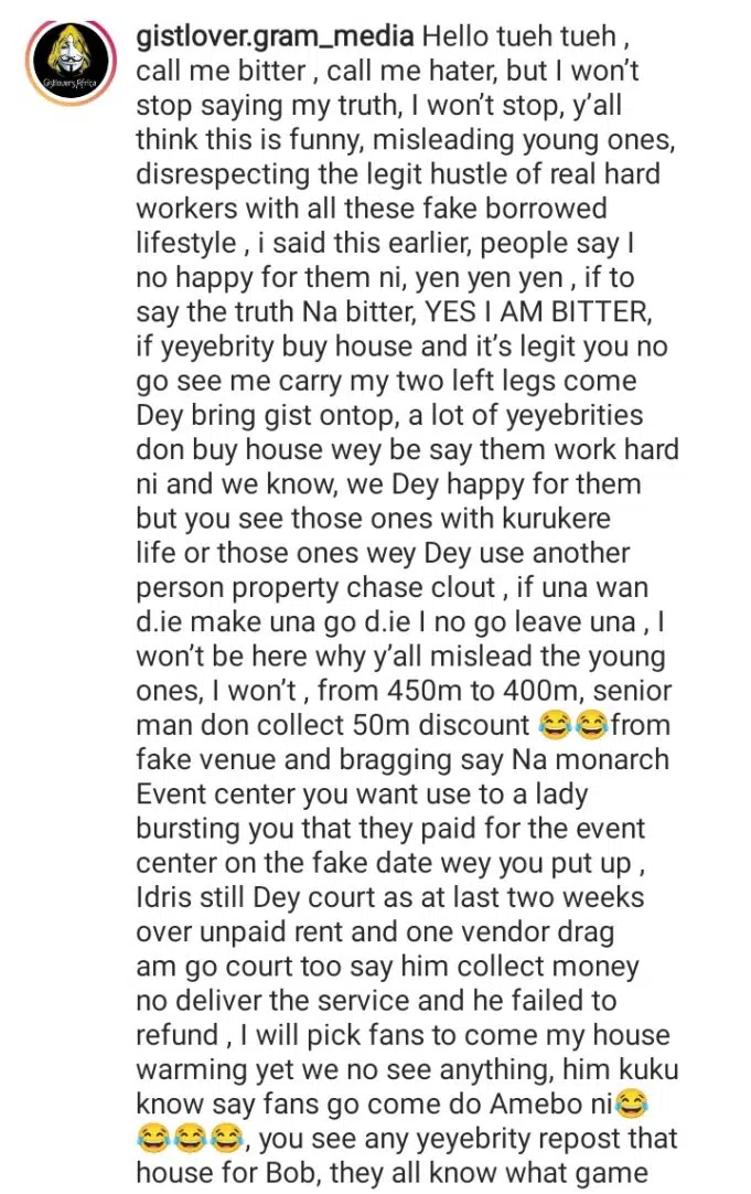 To give more credence to their claim, Gistlover has added that because the whole housewarming thing is a hoax explains why most celebrities didn’t repost to congratulate Bob.