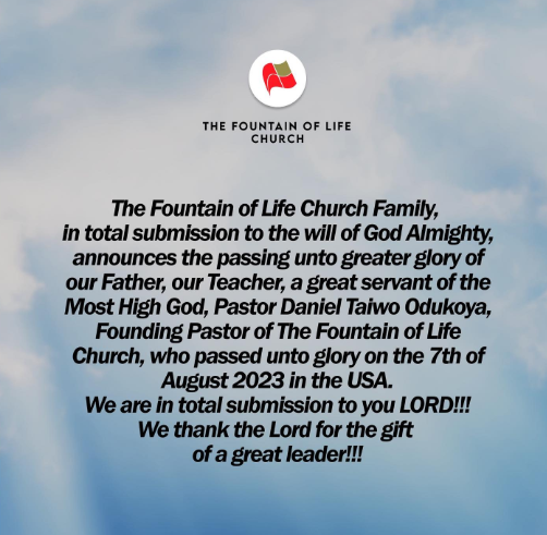 “The Fountain of Life Family, in total submission to the will of God Almighty, announces the passing unto greater glory of our Father, our teacher, a great servant of the Most High God, Pastor Daniel Odukoya, Founding Pastor of the Fountain of Life Church, who passed unto glory on the 7th of August 2023 in the USA. We are in total submission to you Lord!!! We thank the Lord for the gift of a great leader,” the statement read.
