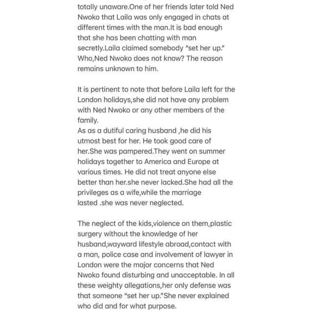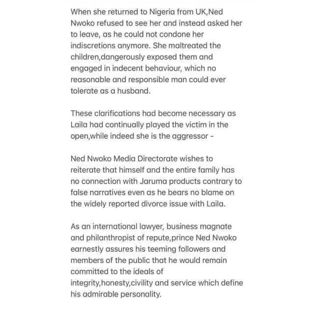 In a statement which he shared via Instagram, Ned claimed that Laila abandoned their kids during vacation in London and lived a wayward lifestyle.