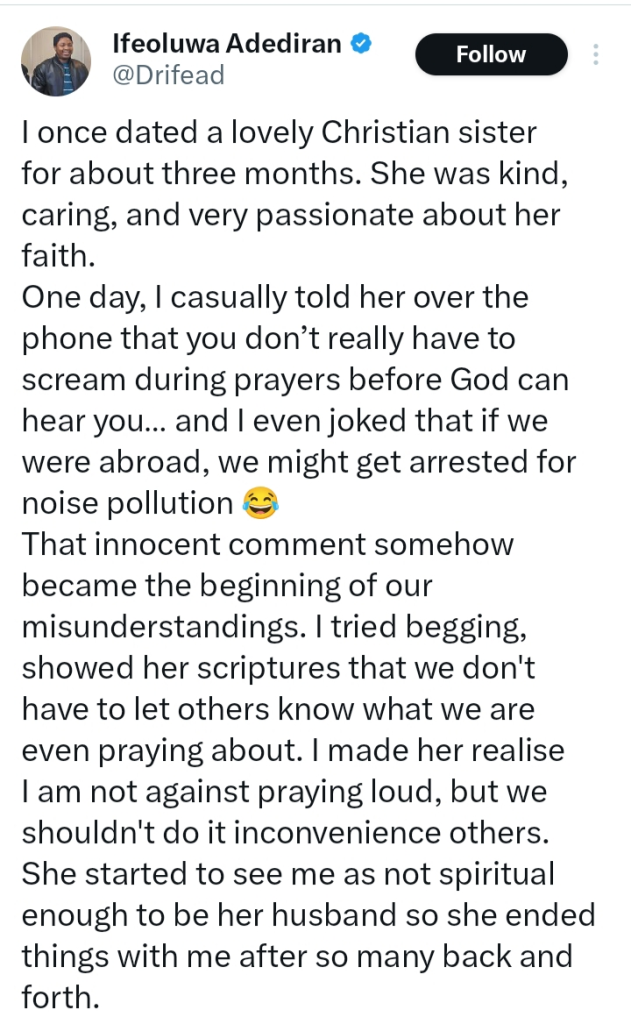 A man known on social media as @Drifeadi recently shared how differences in prayer preferences contributed to the breakup of a past relationship.