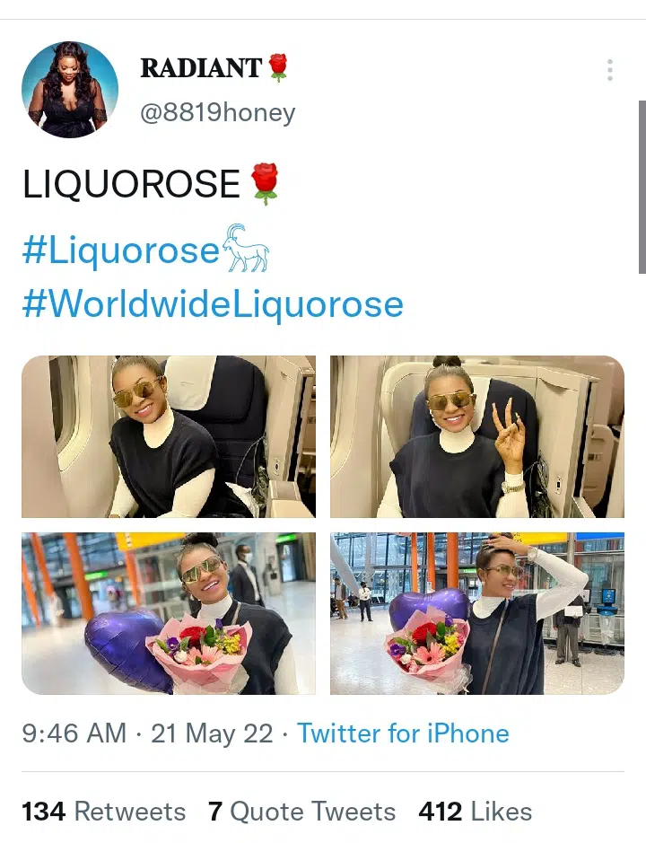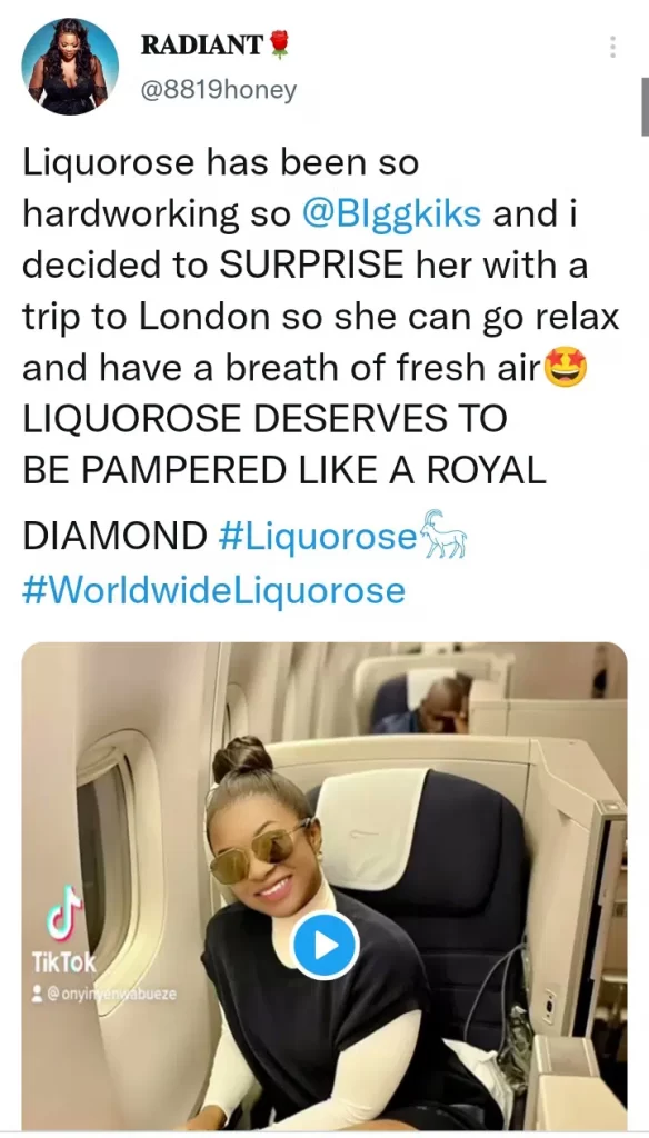 “Liquorose has been so hardworking so @Biggkiks and I decided to surprise her with a trip to London so she can go relax and have a breath of fresh air. Liquorose deserves to be pampered like a royal diamond”.
