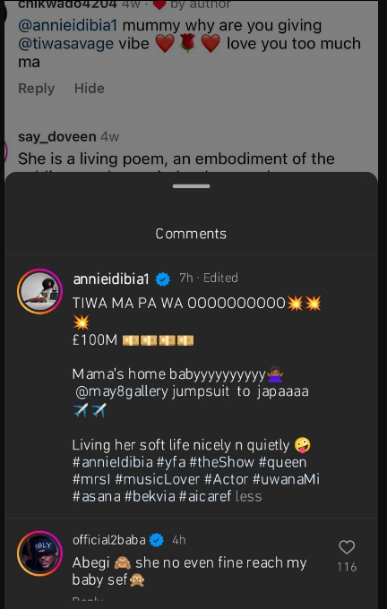 In response, Annie shared the comment with the caption, “Tiwa Ma Pa Wa Oooo £100M. Mama’s home babyyyyy Living her soft life nicely n quietly”.