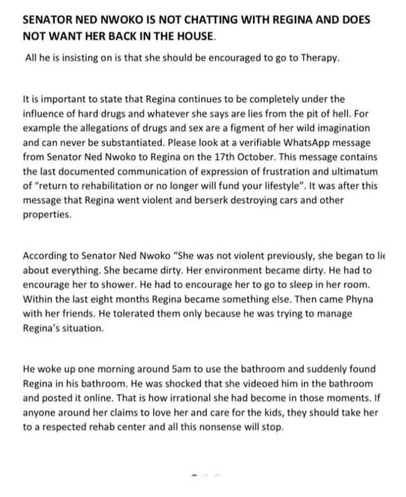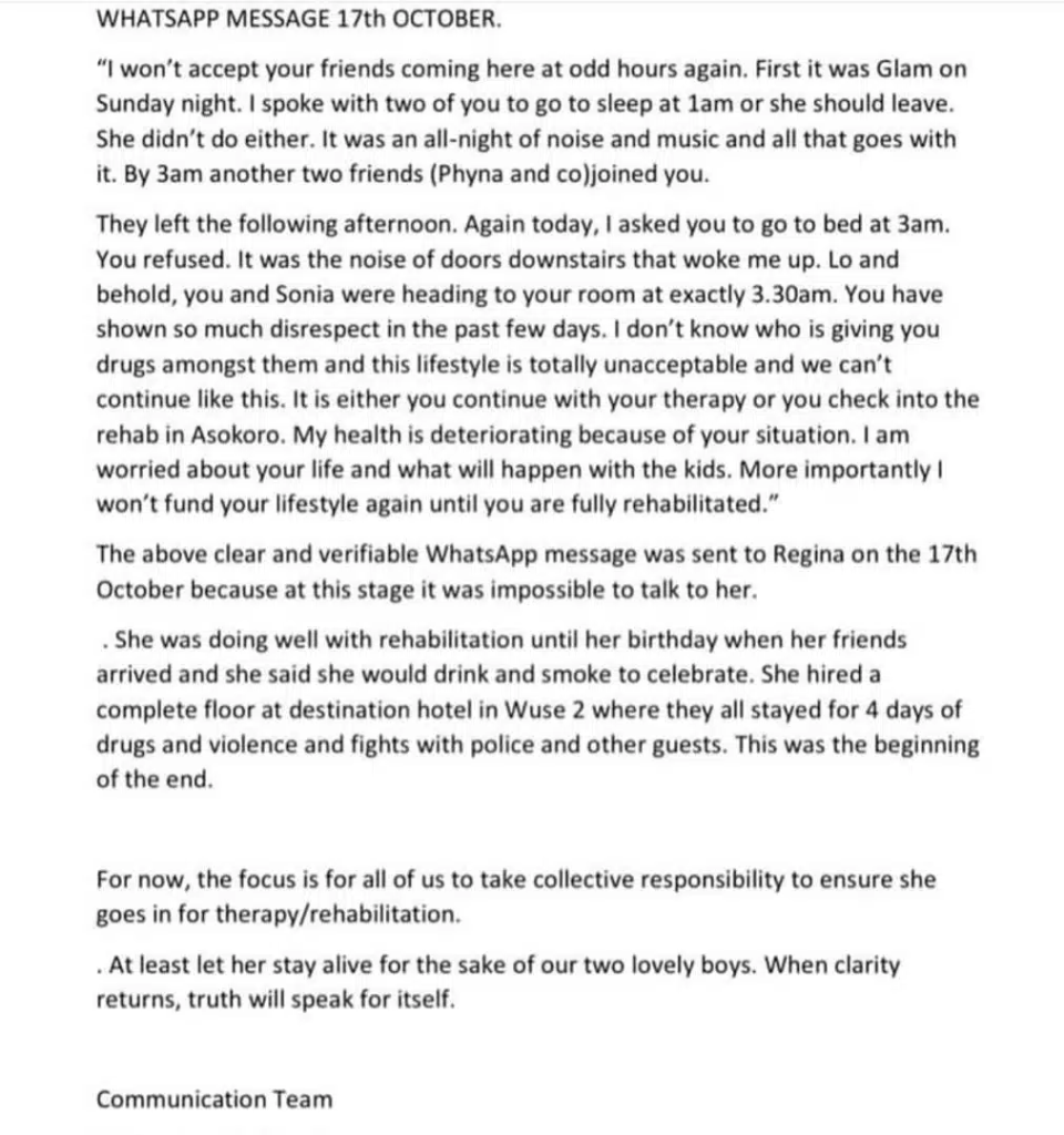 The statement further noted that Regina was reportedly making progress in rehabilitation until her birthday, when she allegedly hosted a four-day hotel party in Wuse 2, which involved drugs, disturbances, and confrontations with law enforcement.