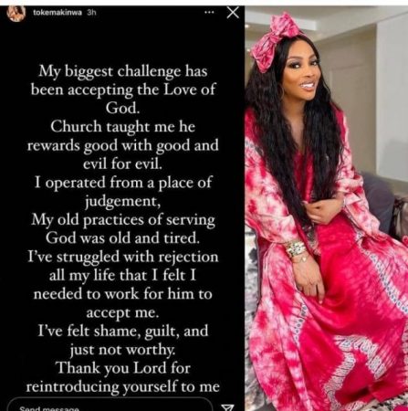 Toke Makinwa now claims that she is born again as she has thanked God for reintroducing Himself to her when she felt shame, guilt, and the thought that she’s just not worthy.