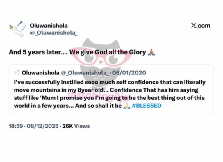 Sharing the original post on December 8, 2025, Ogudu captioned the update simply, “And 5 years later…. We give God all the Glory 🙏🏾.” The post celebrates Boluwatife’s growth and progress since she first shared the inspiring words.