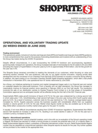 Bloomberg reports that Shoprite is considering selling its Nigerian operations. This process was initiated after the retail chain said in November that it was reviewing its supermarket operations outside South Africa and would consider exiting certain countries if that would help reverse regional sales declines.