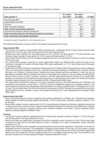 International supermarkets (excluding Nigeria) contributed 11.6% to group sales, and reported 1.4% decline in sales from 2018. South African operations contributed 78% of overall sales and saw 8.7% rise for the year.