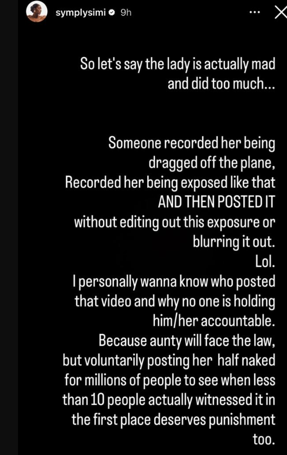 In a post on her Instagram Stories, Simi criticized the act of recording Comfort being forcefully removed from the plane and exposing her indecently before sharing the unedited footage online.