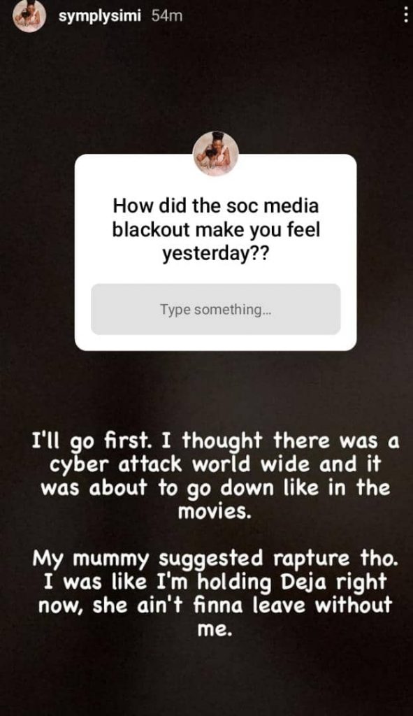 Simi sharing how the social media blackout made her feel said she thought it was a cyber-attack worldwide and it was about to go down like they usually show in movies but fortunately for her it was none of what she was thinking.