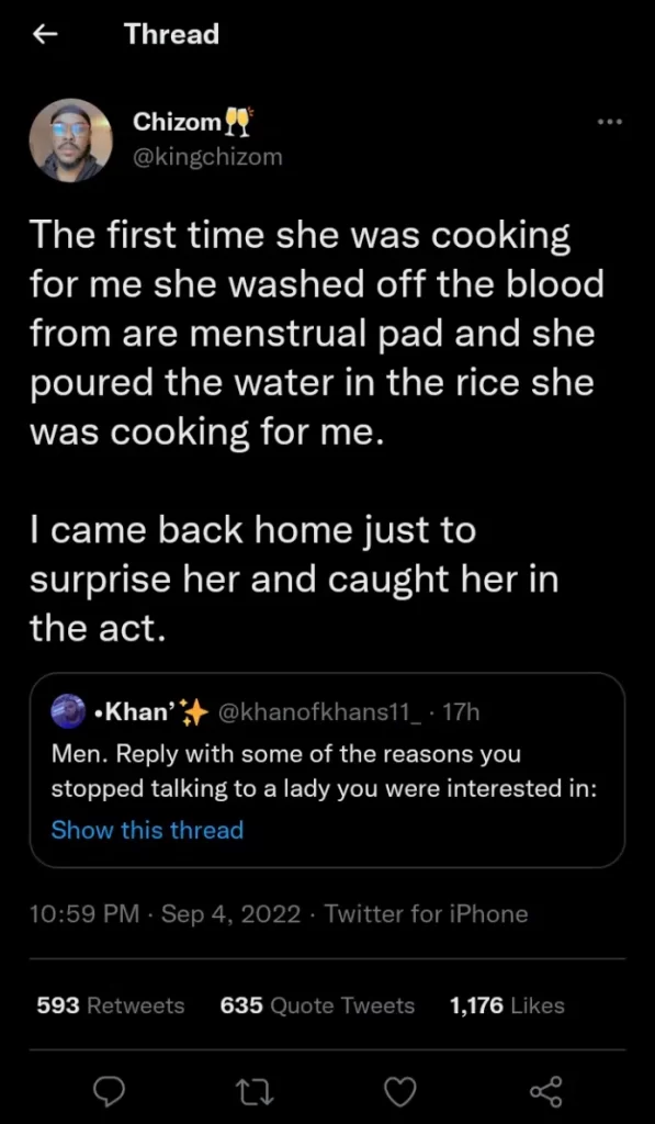 Chizom recounted how he came home to surprise his former Ghanaian girlfriend but got the shock of his life when he caught her squeezing out blood from her menstrual pad into the pot of rice, she was preparing for him.