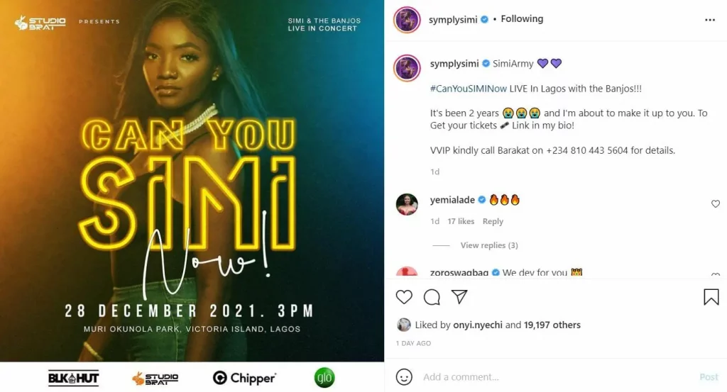 This time, Simi fixed 3 PM for the concert. She wrote; “SimiArmy 💜💜 #CanYouSIMINow LIVE In Lagos with the Banjos!!!”